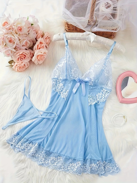 2 Piece Elegant Semi-Sheer Lace Slip Dress with Thong